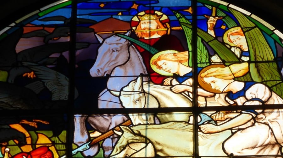 « Puis j’ai vu le ciel ouvert, et voici un cheval blanc : celui qui le monte s’appelle Fidèle et Vrai, il juge et fait la guerre avec justice. Ses yeux sont comme une flamme ardente, il a sur la tête plusieurs diadèmes, il porte un nom écrit que nul ne connaît, sauf lui-même. Le vêtement qui l’enveloppe est trempé de sang, et on lui donne ce nom : « le Verbe de Dieu ». Les armées du ciel le suivaient sur des chevaux blancs, elles étaient vêtues de lin fin, d’un blanc pur. De sa bouche sort un glaive acéré, pour en frapper les nations ; lui-même les conduira avec un sceptre de fer, lui-même foulera la cuve du vin de la fureur, la colère de Dieu, Souverain de l’univers ; sur son vêtement et sur sa cuisse, il porte un nom écrit : « Roi des rois et Seigneur des seigneurs »[19] ».