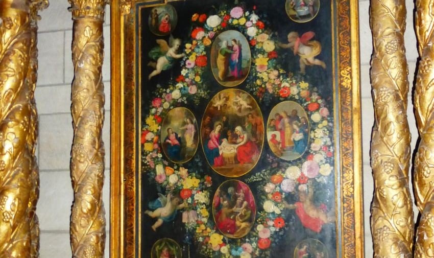 retable médaillon Nativité, N.lockhartretable , présentation Jésus au temple, avec fleurs, N.lockhartLa Nativité au centre est précédée à gauche de l’Annonciation, puis au-dessus de la Visitation, à droite de la Présentation de Jésus au temple et en dessous de Jésus enfant parlant au milieu des docteurs.