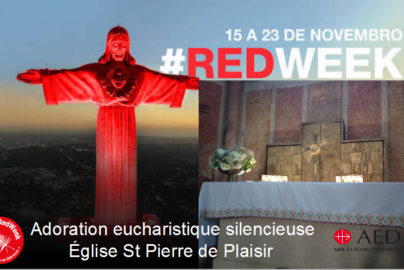 Dans le cadre de la #Redweek organisée par l’Aide à l’Église en Détresse (AED) du 14 au 21 novembre 2025, adoration eucharistique silencieuse en l’église St Pierre de Plaisir (vendredi 14 novembre de 10h à 23h) en union de prières avec tous nos frères et sœurs chrétiens persécutés à travers le monde.