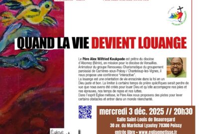 Avec le projet Église métisse, le père Alex Wilfried Koukpode, vicaire de la paroisse de Chanteloup-Carrières-sous-Poissy, donnera une conférence interactive sur le thème « Quand la vie devient louange », mercredi 3 décembre 2025, 20h30, dans la grande salle de l’église Saint-Louis-de-Beauregard à Poissy (30 Av. du Maréchal Lyautey).