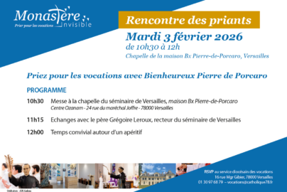 Rencontre annuelle des priants du Monastère Invisible mardi 3 février 2026 de 10h30 à 12h.
